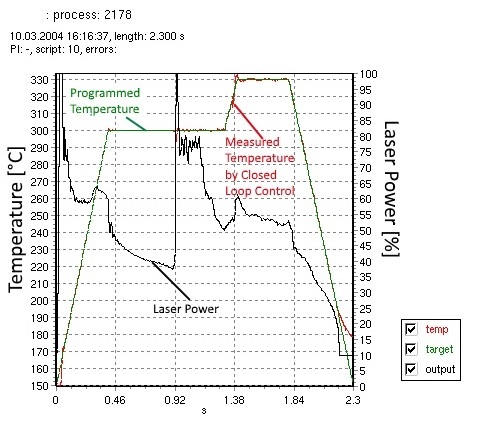 Mergenthaler激光模组可以实现温度闭环控制,测温单元可以在每秒最多检查 10000次事实温度,系统可以根据实测温度的变化来实时改变激光功率,每秒可以最多反应5000次。从而实现优良的焊接控制。