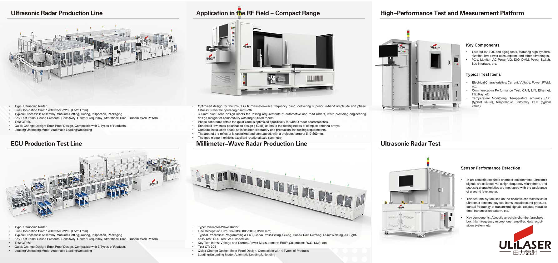 在由力镭射的展位上,一套完整的ADAS(高阶驾驶辅助系统)一站式解决方案成为绝对主角,从核心控制单元到传感器产线,再到专业测试设备,全方位展现了中国企业在智能驾驶领域的硬实力。其中,作为ADAS“大脑”的域控制器,凭借高集成度、强算力的优势,可实现多传感器数据融合与精准决策,为智能驾驶提供稳定可靠的核心支撑;毫米波雷达产线与激光雷达产线则展示了从核心部件研发到规模化生产的全能力,两条产线均采用自动化生产技术,确保了传感器产品的一致性与稳定性,适配不同级别智能驾驶车型需求;而超声波雷达测试暗箱与紧缩场测试系统,更是填补了不少企业在传感器精准测试领域的需求空白,前者能模拟复杂环境下的雷达性能测试,后者则为毫米波雷达等提供高精度的电磁环境测试,助力企业大幅提升产品研发效率。