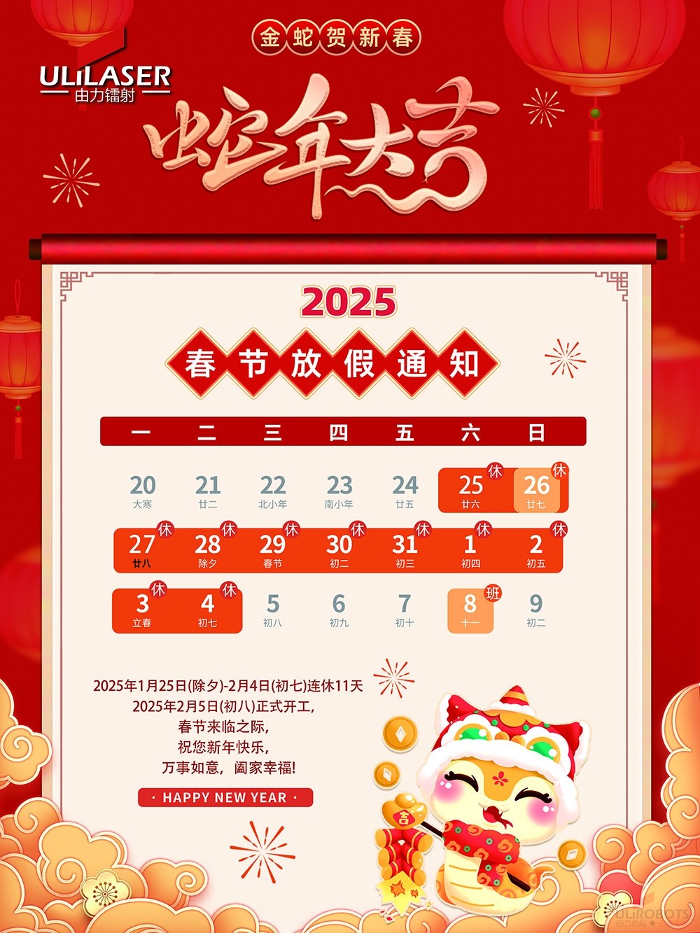 一、公司定于2025年1月25日起开始放年假,开工时间为2025年2月05日(农历大年初八)正式上班,共计:11天。