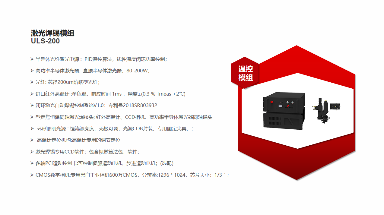 恒温精密激光锡焊机是标准的锡丝焊接╱锡膏焊接设备,主要由自动送锡丝/点锡膏装置,采用单X单Y/双Y配置,也可集成3D-A0I焊点检测功能。自主开发的恒温激光锡焊软件,对不同焊点,不同高度实现加工参数分层处理一次加工完成,同时可在焊接过程中实时监控操作的完成情况。